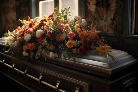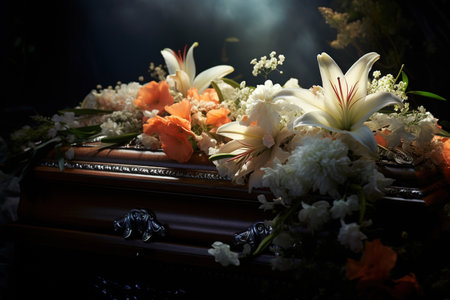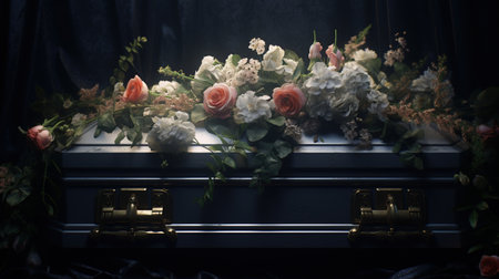 Generative AI, Flowers on a coffin in the funeral or burial services at cemetery, casket with flowers