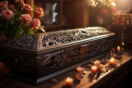 a wooden casket, colorized in darktable processing, is placed in a sunlit setting. candles surround the casket, creating a warm and traditional atmosphere. the realistic figurative details of the foliage add depth to the scene. the casket's red and gold accents enhance its aesthetic appeal. ai generated