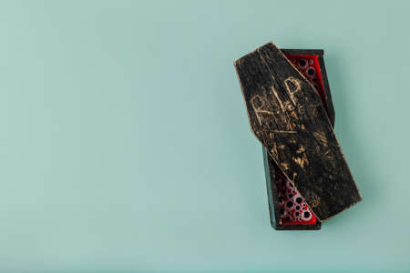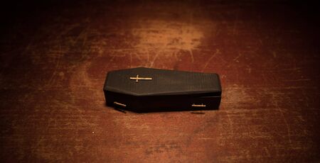Creative artwork. Miniature wooden coffin on a table with dark background. Selective focus