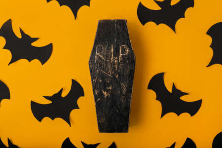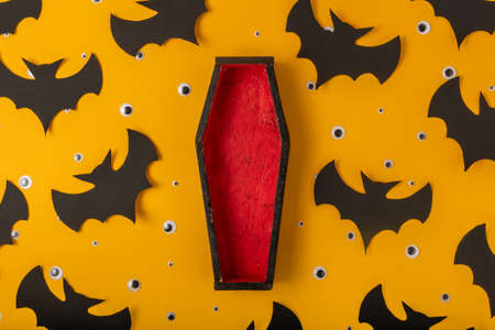 A Halloween yellow background with many bats and black and red coffin in the center. Festive flat lay