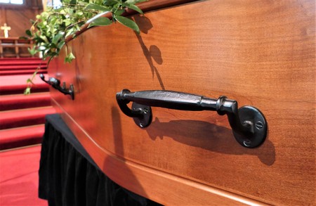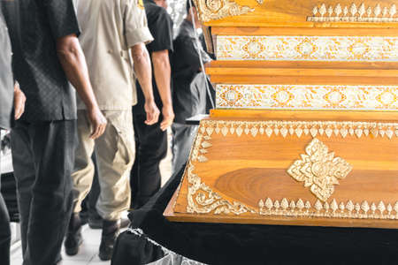 Closeup of funeral casket in hearse or chapel or burial at cemetery