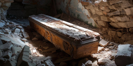 A wooden coffin rests alone in a dimly lit abandoned room, with soft beams of light creating a haunting atmosphere and inviting contemplation of life and death.