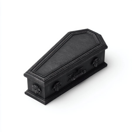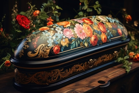 A striking black coffin showcasing detailed craftsmanship and solemn elegance. This image is perfect for themes of memorial, mourning, and respectful remembrance.