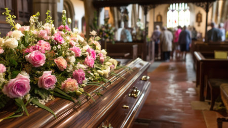 A serene funeral scene featuring a beautifully arranged casket with pink roses and white flowers, surrounded by mourners in a church, reflecting a moment of loss and remembrance.