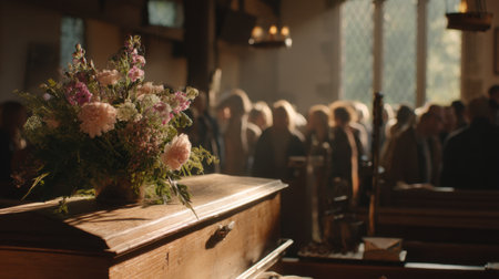 A heartfelt scene inside a church featuring a floral arrangement atop a wooden coffin, capturing the essence of a memorial service filled with emotion and remembrance.