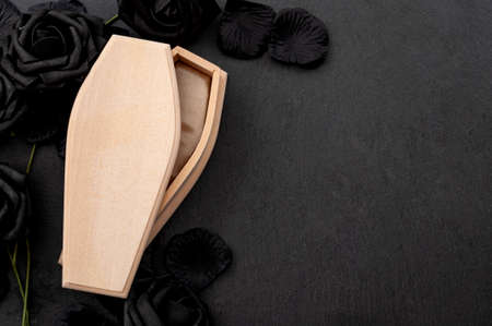 Funeral home, death, memento mori (latin - remember that you must die) and grief for the dead conceptual idea with wood coffin surrounded by black roses on dark background with copy space
