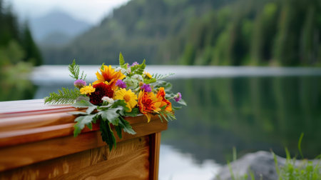 This image showcases a vibrant floral arrangement atop a wooden surface, highlighted by a tranquil lake backdrop surrounded by lush greenery.