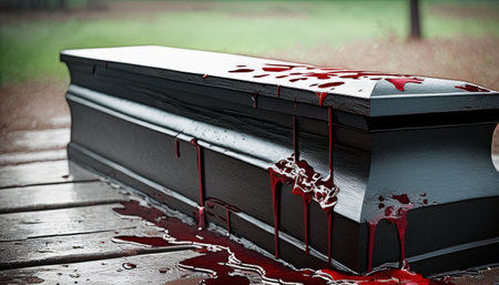 A closed coffin drips with fresh red blood on a wet wooden porch, suggesting a recent sinister event.. AI Generation