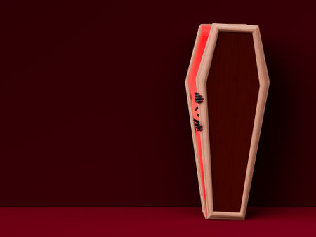half open coffin with devilish hands peeking out with red background and copy space. halloween concept. 3d rendering