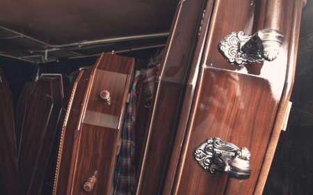 closeup shot of a casket in a hearse or chapel before funeral or burial at cemetery