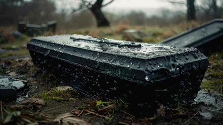 Rain-soaked black coffin in a graveyard, evoking a solemn and depressive funeral ceremony. Emotional farewell