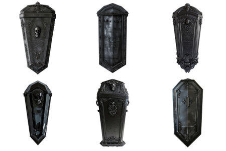 Six Ornate Black Coffins with Skull and Crossbone Motifs