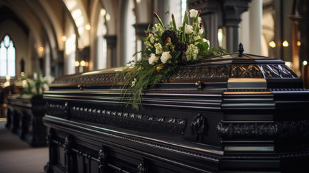 Black coffin in church, funeral