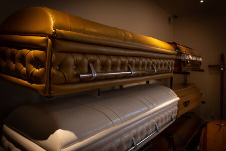 Coffins are presented in shop of undertaker