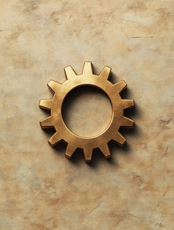 A golden gear symbol is centered on a warm, textured surface, perfect for projects related to mechanics or technology.