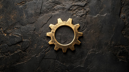 Close up view of metallic gear resting on textured surface, showcasing intricate details and shiny finish. warm lighting highlights gear features, creating captivating industrial aesthetic