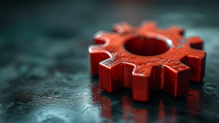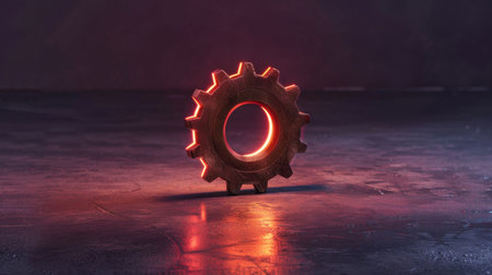 Glowing gear symbolizing innovation and technology stands prominently against dark background, reflecting light and creating captivating atmosphere