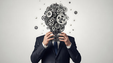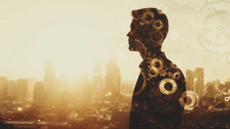 double exposure photograph. A silhouette of a businessman stands tall against the urban skyline, seamlessly merged with intricate gears and cogs. industrial elements symbolize precision and progress.