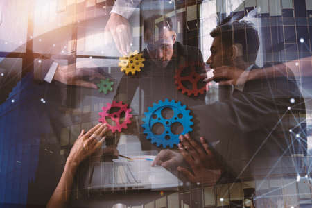 Business team connect pieces of gears. Teamwork, partnership and integration concept. Double exposure