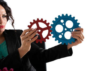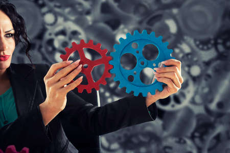 Businesswoman tries to connect gears pieces. Concept of Teamwork, partnership and integration