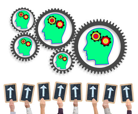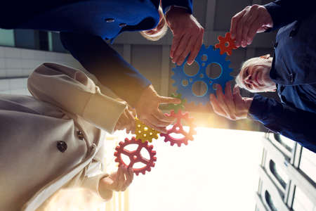 Strategy team solution teamwork partnership community alliance integration planning union concept. Groups of young people hold gear hands.