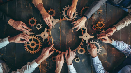 A captivating image depicting diverse hands collaboratively working on gears representing business strategies and management, symbolizing teamwork and growth.