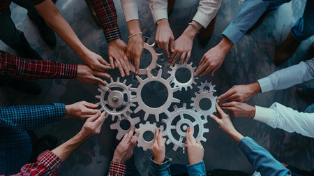A diverse team of business professionals unites, their hands working in concert to turn a complex system of golden gears.