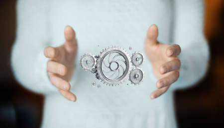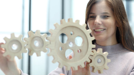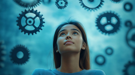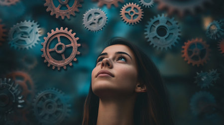Close-up portrait of a young woman surrounded by gears and cogwheels