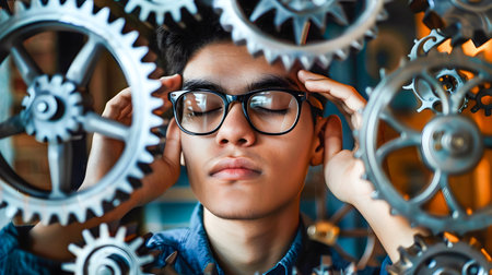 Young man wearing glasses with eyes closed concentrating deeply with his hands on his head surrounded by cogwheels and gears symbolizing the process of brainstorming