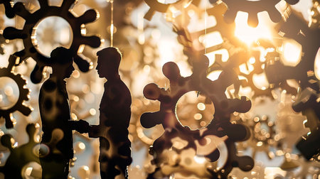 Two hands connect gears that emit light, symbolizing teamwork and innovation in technology. This image represents the power of collaboration and creativity.
