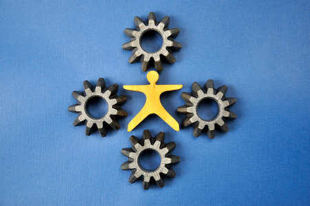 Wooden figures of people with metal gears close up. Hire personnel, team building, teamwork concept. People connection in business.