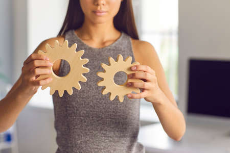 Cropped business woman or company manager attaches two wooden gears to each other in front of her. Concept of finding a solution and building an effective business system that works great.