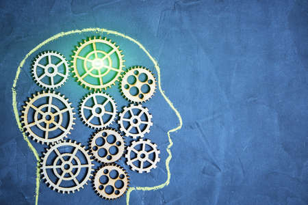 Silhouette of human head, chalk on the wall, gears in head, brainstorming, extraordinary thinking and intelligence