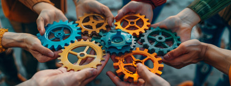 A dynamic representation of teamwork, showcasing diverse hands holding gear icons that symbolize collaboration, innovation, and strategic thinking in a business context. Amity