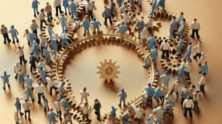 Miniature Workers Operating on Interlocking Mechanical Gears for Industry and Teamwork Concept