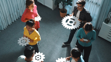 Top down aerial view of business team working together to gather cog together. Aerial view of professional diverse group holding cog and complete white gear. Represented unity, teamwork. Symposium.