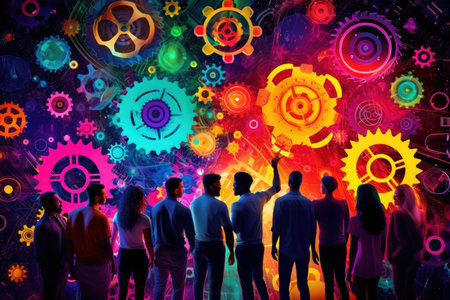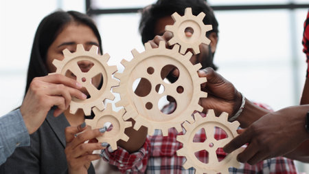 Group of multiracial people joining gear wheels together as metaphor for effective team collaboration, unity, teamwork, finding working solutions and creating business systems. From below, low angle