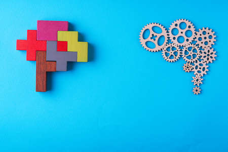 Human brain is made gear mechanism and colorful shapes on blue background. The brain is viewed through a magnifying glass. Two different thought processes, concept of different thinking.