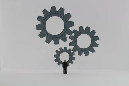 Miniature Figurine on Interlocking Gears Symbolizing Business and Mechanical Engineering Concept