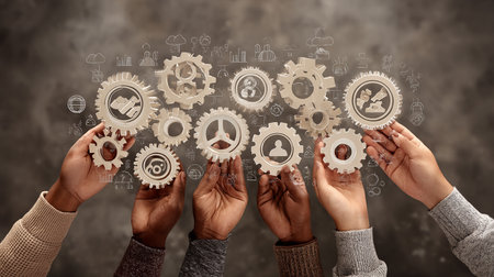 A dynamic scene showcasing diverse hands holding various gear symbols, representing teamwork and collaboration in a professional environment for business development. Amity