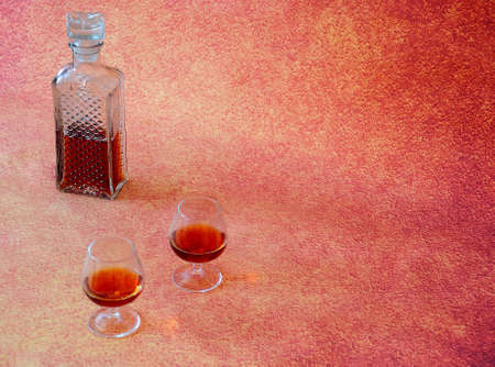 Crystal bottle of cognac and two glasses with a drink on a brown abstract background. Close-up.