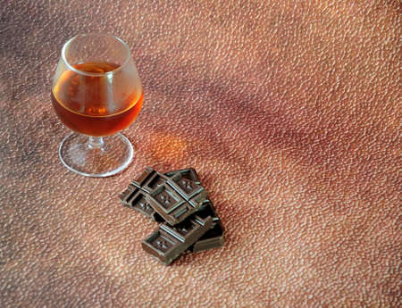 Glass goblet with cognac and pieces of chocolate on a brown abstract background. Close-up.