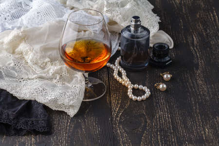 Cognac glass on a wooden table, the glass filled with alcoholic binge against a surface from old boards, nobody.