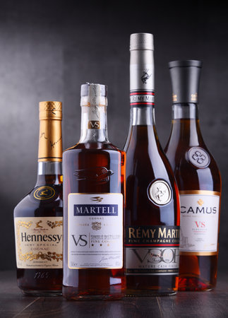 POZNAN, POL - SEP 27, 2018: Bottles of famous Cognac brands including Martell, Camus, Hennessy and Remy Martin.