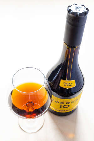 Moscow, Russia - October 16, 2021: closed bottle with TORRES Gran Reserva 10 brandy and wineglass. Torres 10 Gran Reserva is the most popular Spanish brandy in world, it has been produced since 1946