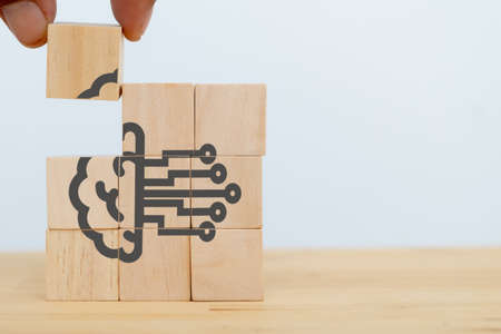 Artificial Intelligence and machine learning concept in humanoid brains. AI with digital brain is learning processing big data, analysis information. Putting wooden cubes with AI icon, background.