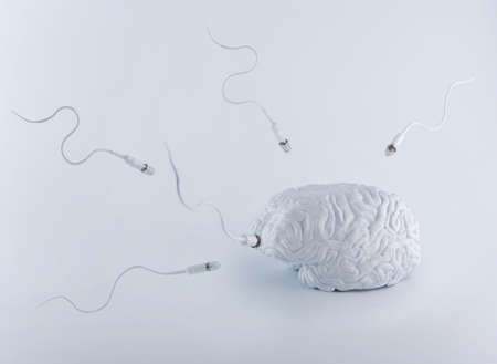 An illustration presents a brain composed of textured, fragmented material, suggesting a complex idea. The image utilizes a neutral color palette with white and gray tones. The composition is likely created digitally, with an emphasis on texture and detail. This image is potentially useful for projects related to psychology, innovation, or conceptual design.