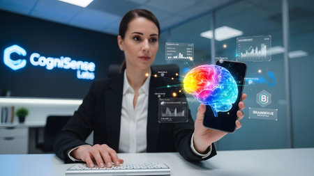 A businesswoman interacts with advanced ai technology, showcasing data analytics and intelligent systems