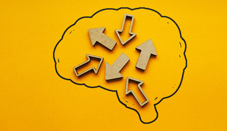 Illustration shows a brain surrounded by various data points and information elements, emphasizing the concept of mental overload and complexity.