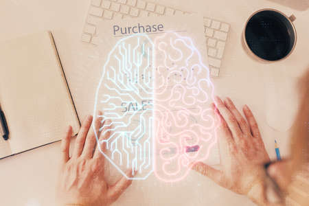 Haman brain double exposure icon with man hands background. Concept of Ai.